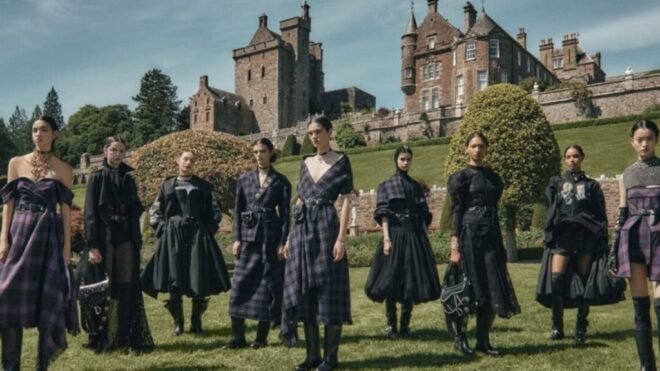 Nessa segunda-feira (3), a Dior apresentou sua coleção cruise 2025 nos jardins do castelo Drummond , em Perthshire, na Escócia. A passarela foi aberta por uma modelo tocando gaita de foles em um vestido volumoso vermelho – nesta coleção, o país se tornou a base narrativa.