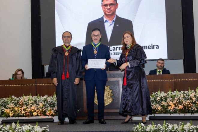 O diretor-superintendente do Sebrae e vice-presidente da Fecomércio, Marcos Lameira, foi um dos agraciados com a honraria, um reconhecimento às relevantes contribuições para o fortalecimento da democracia e apoio institucional à Justiça Eleitoral.