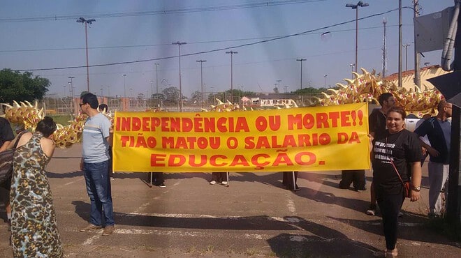O presidente da Juventura do PT, Césário Braga, que também se diz chefe de gabinete do deputado federal Léo de Brito, é acusado de ordenar um ataque aos professores, na manhã desta segunda-feira(7), durante o deslife cívico na Avenida Amadeo Barbosa. Os professores levantavam cartazes e faixas na parte reservada ao público, por trás do alambrado, protestando contra o corte de salários e as ameaças de demissão durante a greve da categoria, que durou 65 dias. Uma das faixas dizia: “Greve no governo do PT é crime”.