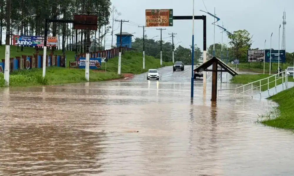 Imagens captadas pela reportagem mostram a via completamente tomada pela água nas proximidades da Igreja Batista do Bosque (IBB) e da Havan, área que costuma registrar transtornos recorrentes durante períodos de chuva intensa, dificultando a passagem de veículos.
