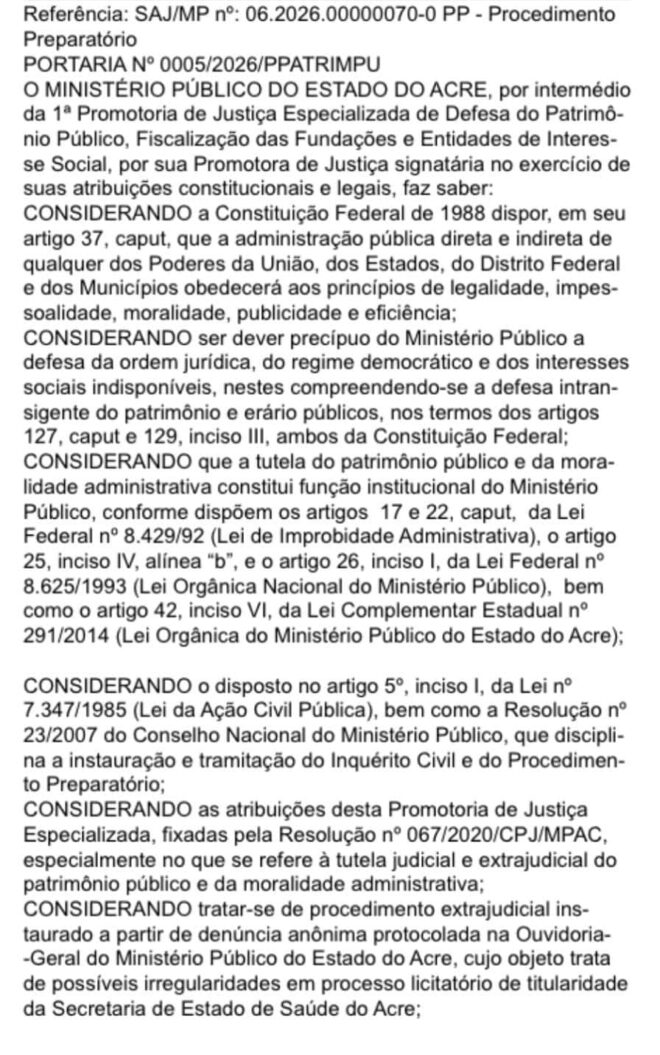 O Ministério Público do Estado do Acre (MPAC) instaurou Procedimento Preparatório para apurar possíveis irregularidades em processo licitatório vinculado à Secretaria de Estado de Saúde do Acre. A medida foi formalizada por meio da Portaria nº 0005/2026/PPATRIMPU, assinada pela promotora de Justiça Myrna Teixeira Mendoza, da 1ª Promotoria de Justiça Especializada de Defesa do Patrimônio Público.