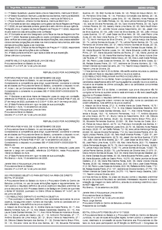 A Procuradoria-Geral do Estado do Acre (PGE/AC) publicou nesta terça-feira, 16, o resultado definitivo da prova objetiva e o resultado preliminar da prova discursiva do XXII Processo Seletivo para Estágio em Direito, conforme previsto no Edital nº 08/2025.