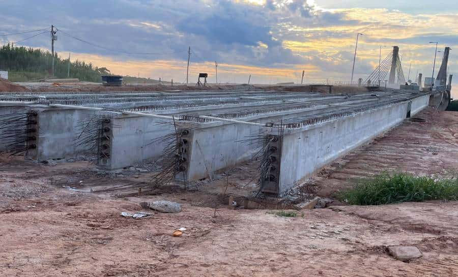 A primeira fase da concretagem das nove vigas longarinas foi finalizada no mês de dezembro passado, dentre as 12 vogas previstas no projeto, cada uma com 35 metros de comprimento e já está em fase de espera da cura do concreto para dar continuidade com proteção das vigas longarinas, informou a equipe gestora da obra.