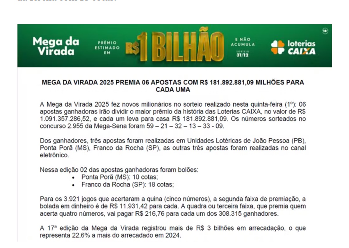 Dois bolões levaram a Mega da Virada — em Ponta Porã (MS) e Franco da Rocha (SP). Também houve um ganhador em João Pessoa (PB) e outros três que fizeram os jogos pelo canal eletrônico.