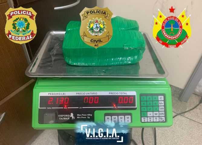 Eles foram parados na barreira montada no rio Liberdade, na divisa entre Cruzeiro do Sul e Tarauacá, o garupeiro transportava um saco com produtos alimentícios e a droga escondida.