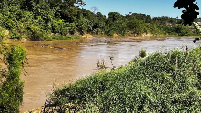 Na divisa entre os município de Brasiléia, Epitaciolândia e Cobija (BO), registro o aumento do rio Acre por volta do meio-dia deste sábado, dia 11 – Foto: Alexandre Lima