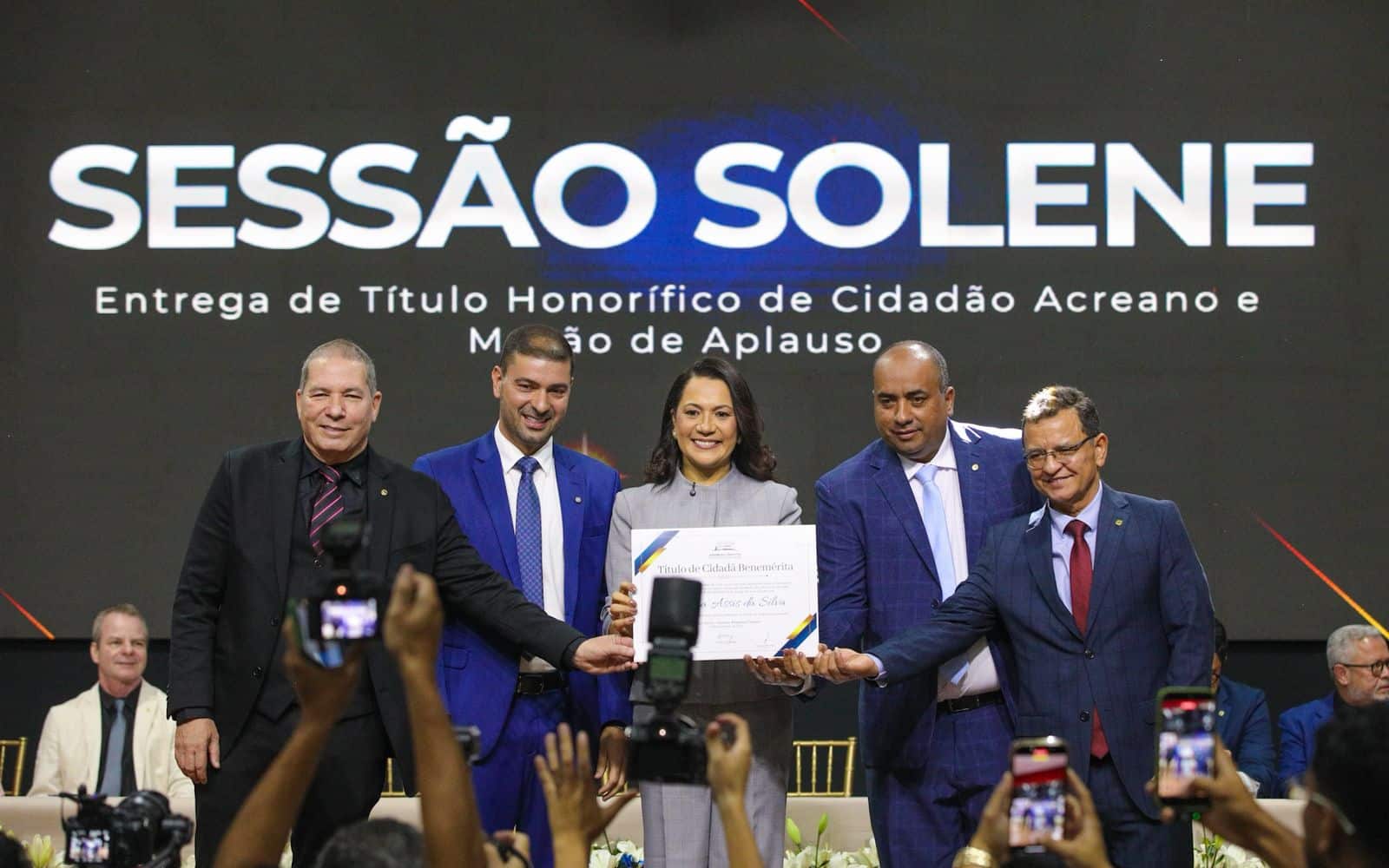 A sessão solene também homenageou a vice-governadora Mailza de Assis, com a entrega da honraria de Cidadã Benemérita, uma das mais importantes distinções concedidas pela Assembleia Legislativa do Estado do Acre. O reconhecimento é destinado a personalidades que se destacam pelos serviços prestados à sociedade acreana e pela contribuição relevante ao desenvolvimento social e institucional do Estado, simbolizando o reconhecimento do Parlamento à trajetória e ao compromisso da vice-governadora com as causas públicas e com a população do Acre.