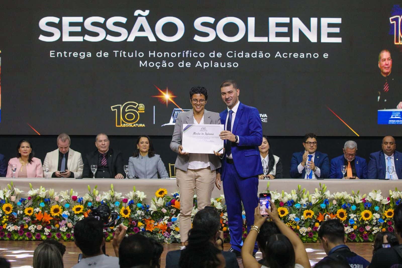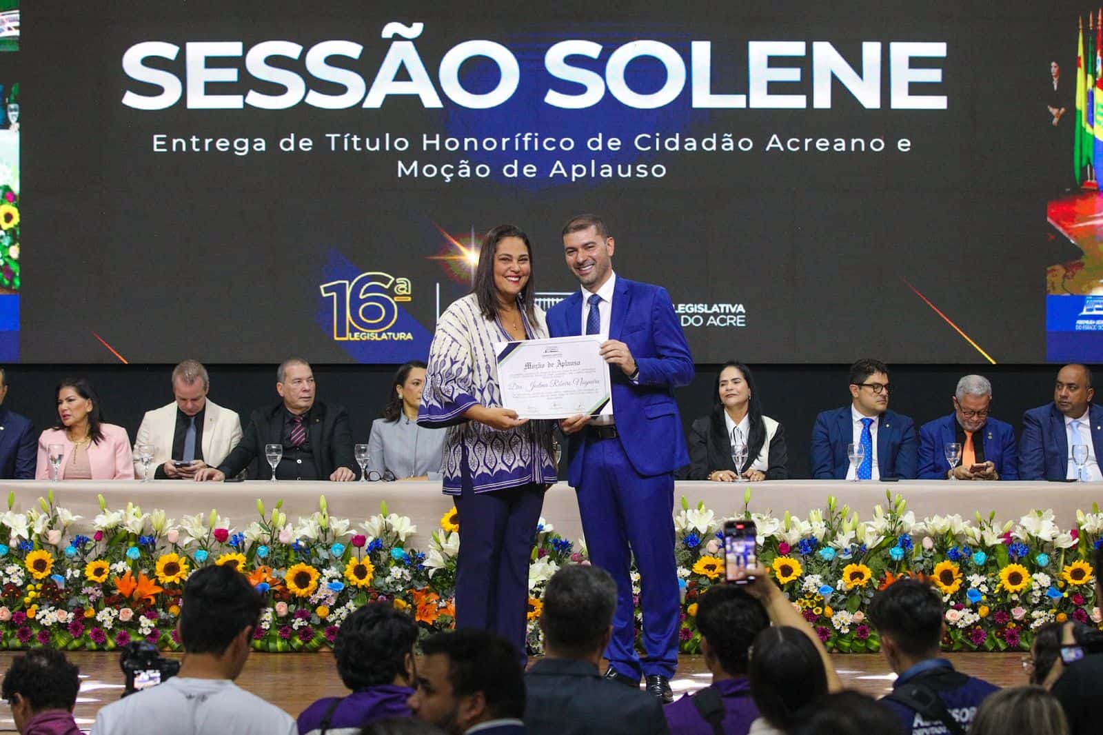Entre os Títulos de Cidadão Acreano que foram entregues durante a sessão, destacam-se os concedidos, por proposição da Mesa Diretora da Aleac, às senhoras Débora Ribeiro da Cunha e Miriam do Carmo Paiva e Silva, além do título destinado ao senhor Andryo Marrane Amaral.