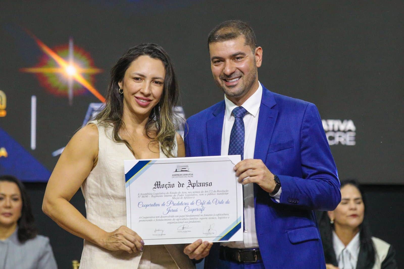 Entre as Moções de Aplauso entregues destaca-se a homenagem à Cooperativa de Produtores de Café do Vale do Juruá (Coopercafé), em reconhecimento ao papel fundamental que a instituição vem desempenhando no fortalecimento da cafeicultura no Acre. A cooperativa tem se destacado pelo incentivo à agricultura familiar, oferecendo suporte técnico, logístico e organizacional aos produtores, contribuindo diretamente para a geração de renda, o desenvolvimento sustentável e o fortalecimento da economia regional.