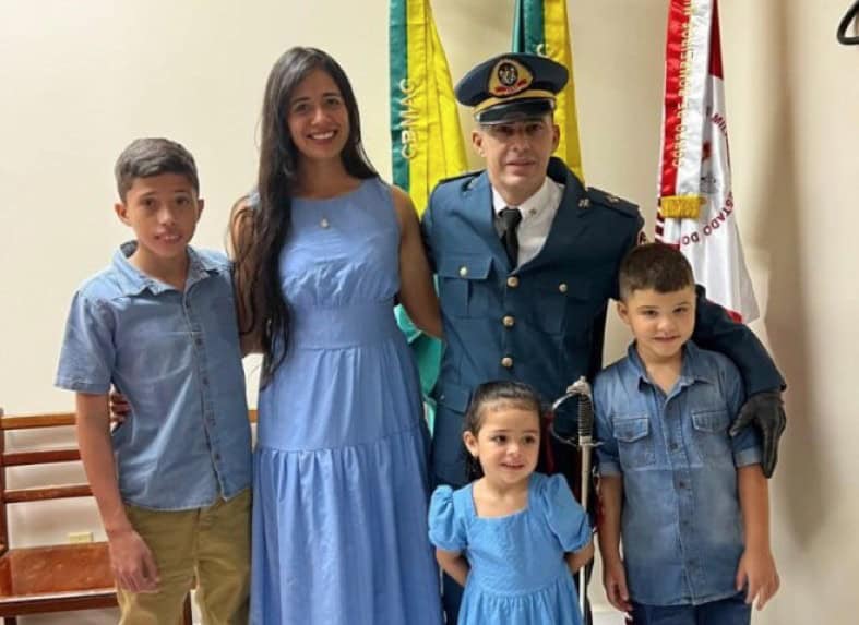 2º Tenente do Corpo de Bombeiros Militar do Acre (CBMAC), Alferino Cândido Ângelo Neto, com a esposa e os três filhos. Foto: Acervo pessoal