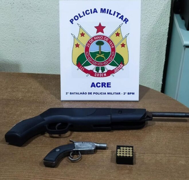 Na madrugada deste domingo, 30, uma guarnição da Polícia Militar do Acre (PMAC) localizou e apreendeu duas armas de fogo, na rua Antônio Carlos M. Melo, bairro Cidade do Povo.