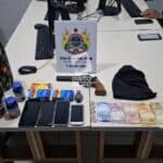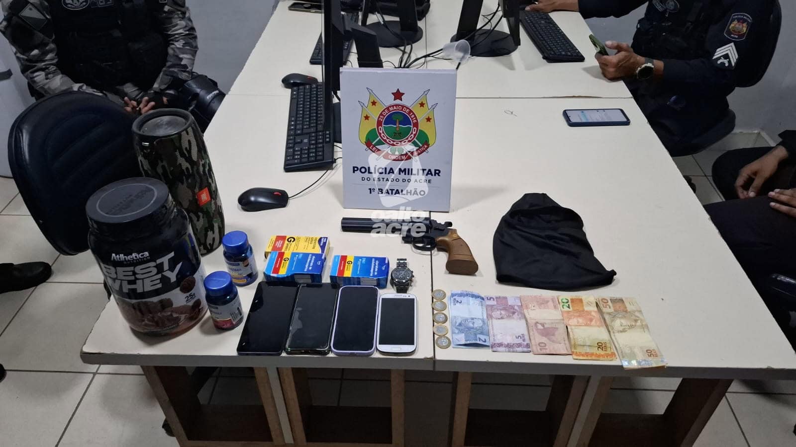 Durante a abordagem, os policiais apreenderam suplementos alimentares, medicamentos, relógios, aparelhos celulares, uma quantia em dinheiro e um simulacro de arma de fogo, semelhante a um revólver calibre 38, utilizado para intimidar os funcionários durante o crime.
