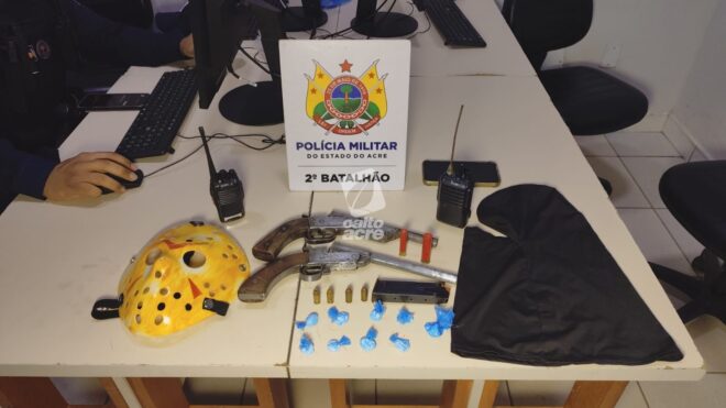 Debaixo de um sofá foram encontradas duas escopetas, calibres 28 e 36, ambas municiadas com cartuchos intactos. Também foram apreendidos dois rádios comunicadores e duas balaclavas. Segundo a PM, Victor assumiu ser o dono dos materiais.