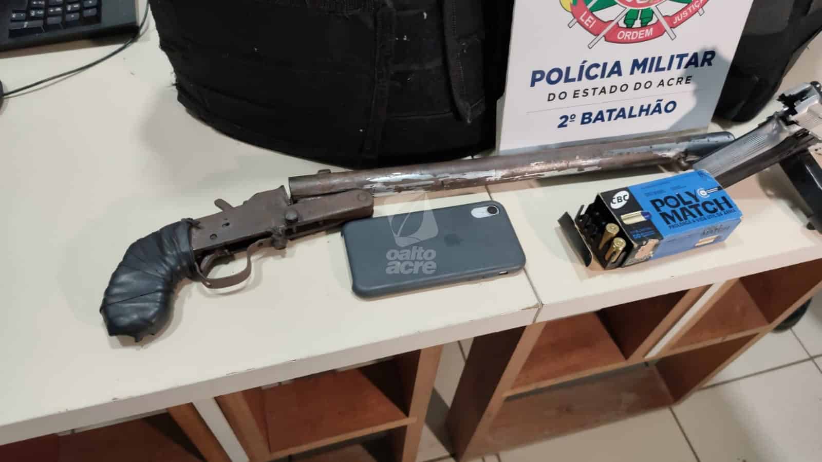 Durante a abordagem, os policiais encontraram uma espingarda calibre 16 com numeração raspada. O suspeito alegou que portava a arma para defesa pessoal e revelou a existência de outros armamentos escondidos em um imóvel abandonado na Quadra 11A.