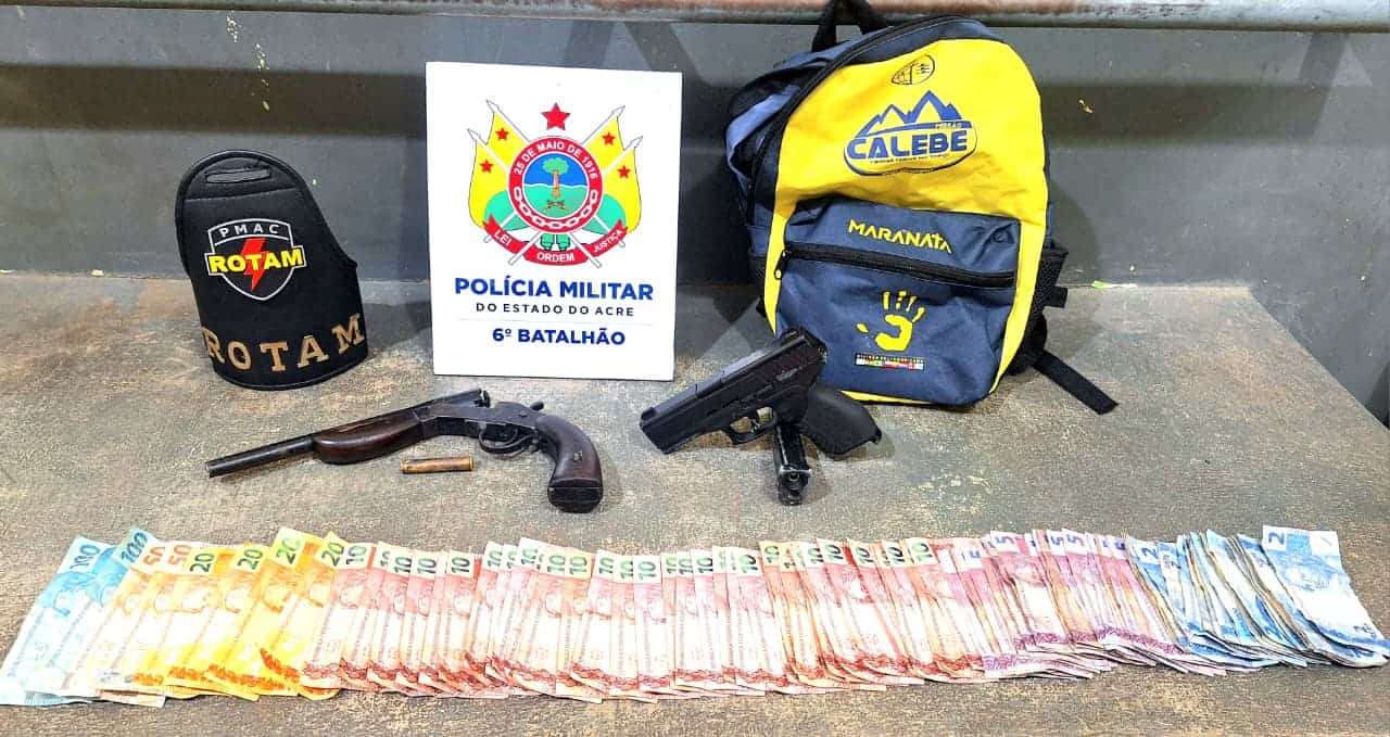 Em uma ação rápida, a Polícia Militar do Acre (PMAC), por meio do 6º Batalhão, prendeu em flagrante, dois homens que tinham acabado de cometer um roubo a um comércio localizado no bairro João Alves, em Cruzeiro do Sul. Uma escopeta e uma réplica de pistola foram apreendidas durante a ação.