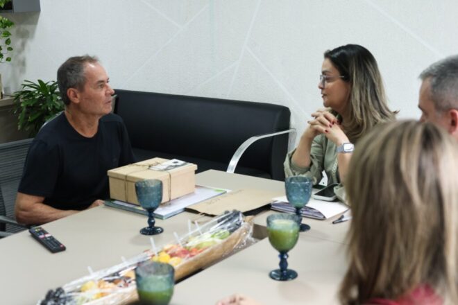Secretária Nayara Lessa (à direita) durante conversa com o jornalista. Foto: Dhárcules Pinheiro/Secom