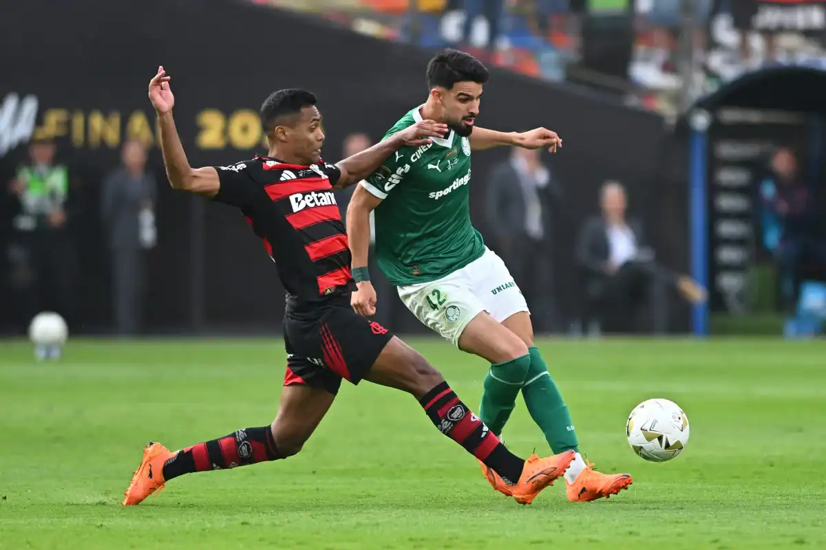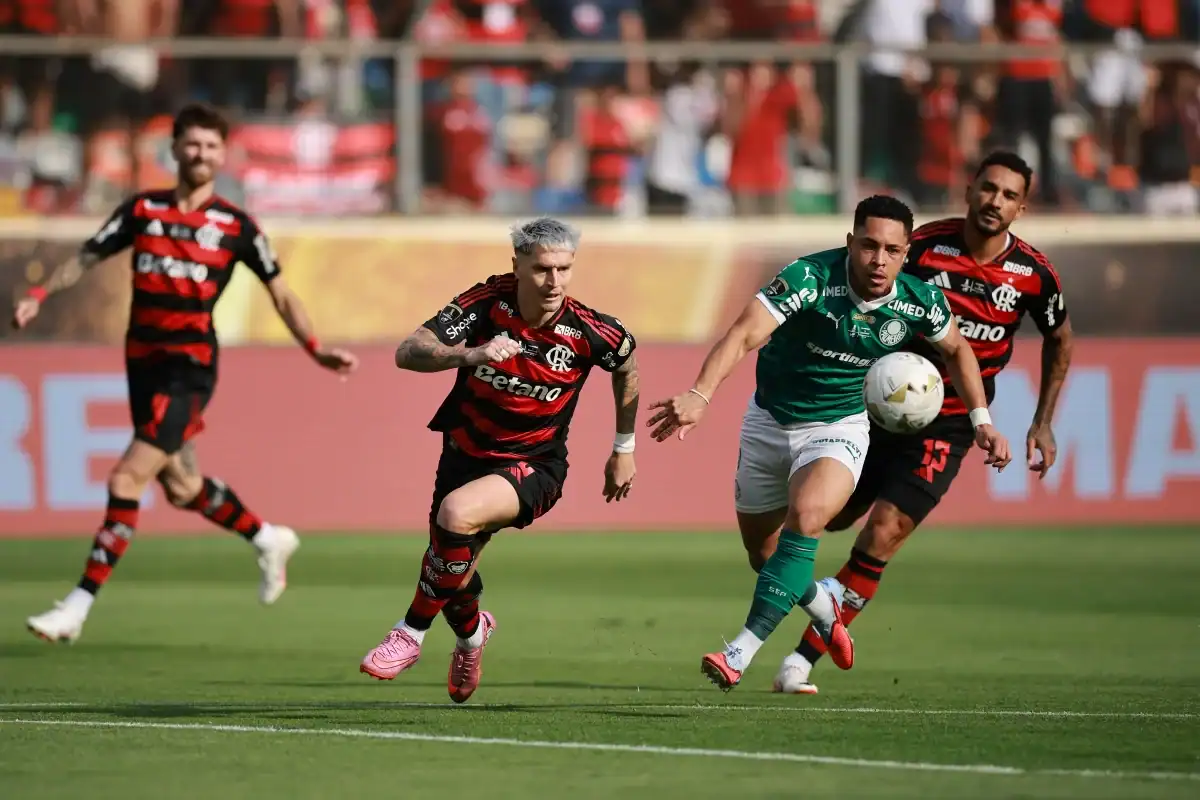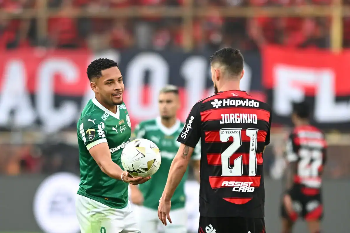 A primeira etapa foi marcada mais pelo nervosismo e pela imposição física do que pela técnica refinada. O Palmeiras, dono da melhor campanha da competição, encontrou dificuldades para impor seu ritmo diante de um Flamengo bem postado defensivamente. O jogo foi truncado, com muitas faltas e cartões amarelos distribuídos para ambos os lados, incluindo Raphael Veiga e Arrascaeta.