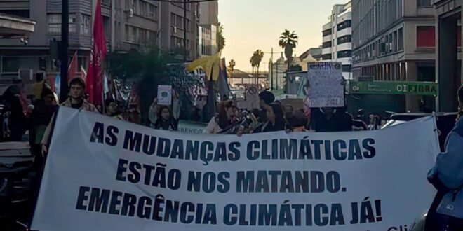 A organização não governamental (ONG) Eco Pelo Clima realizou nesta sexta-feira (31), em Porto Alegre, marcha de protesto, dentro do movimento global sobre o tema. Durante o evento, os manifestantes afirmaram que as enchentes que assolaram o Rio Grande do Sul desde o fim de abril são fruto do descaso dos governantes, quem classificaram de “negligentes e incompetentes”. Eles se referiam ao governador Eduardo Leite e ao prefeito da capital, Sebastião Melo.