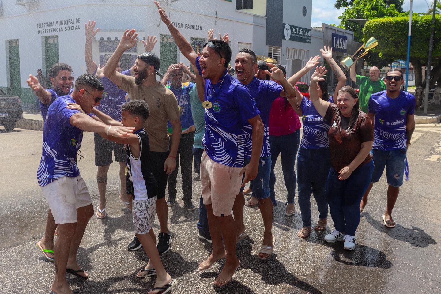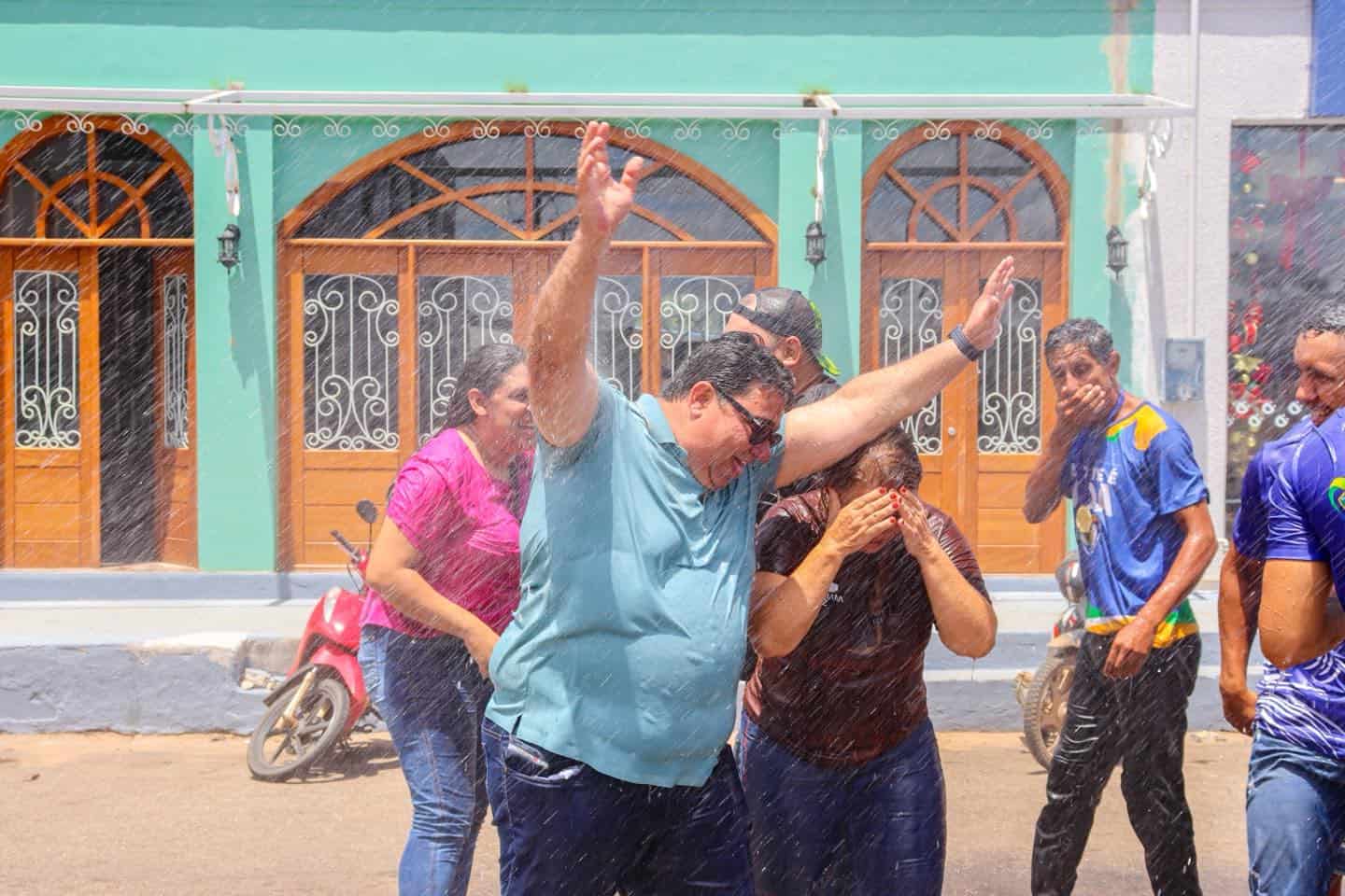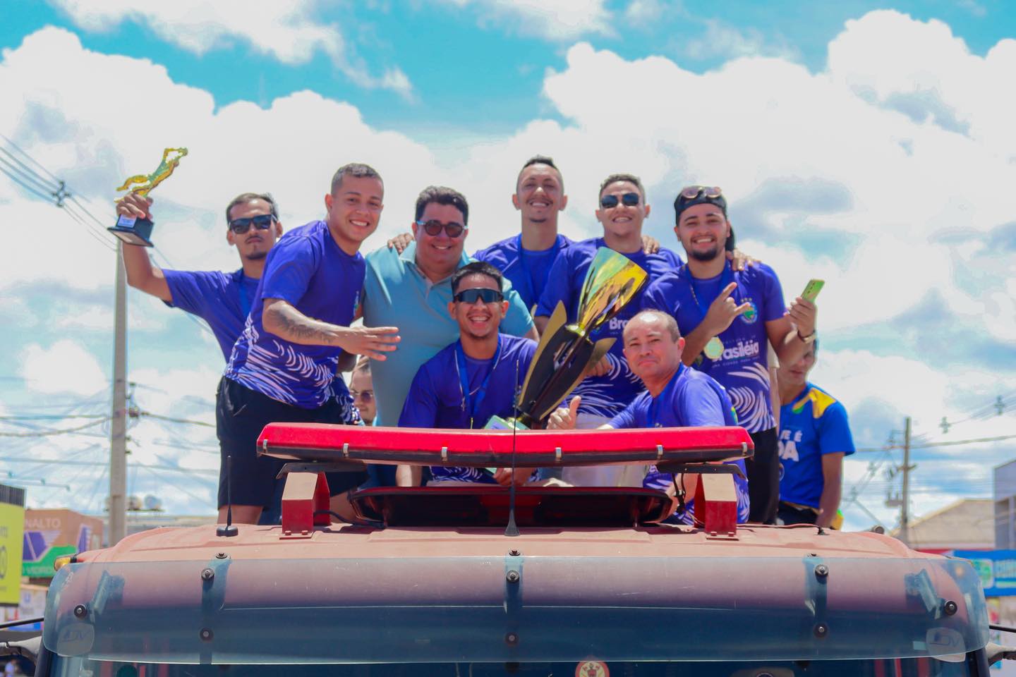 O prefeito Carlinhos do Pelado (PP) se juntou aos atletas tetracampeões e, em clima de descontração, participou do banho de mangueira realizado pelo Corpo de Bombeiros na principal avenida da cidade.
