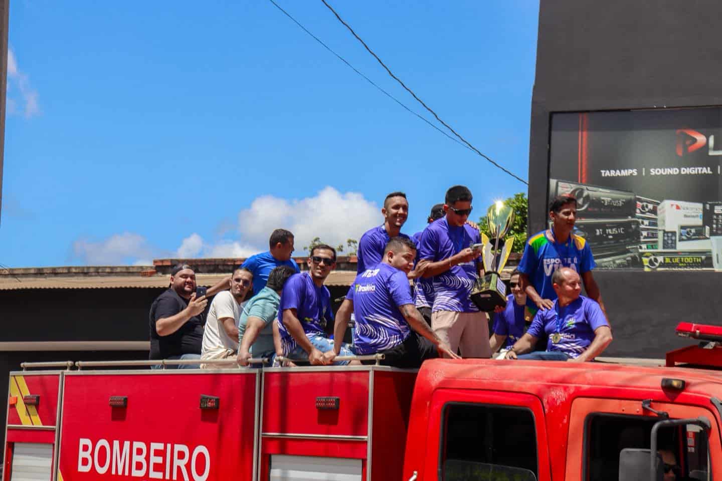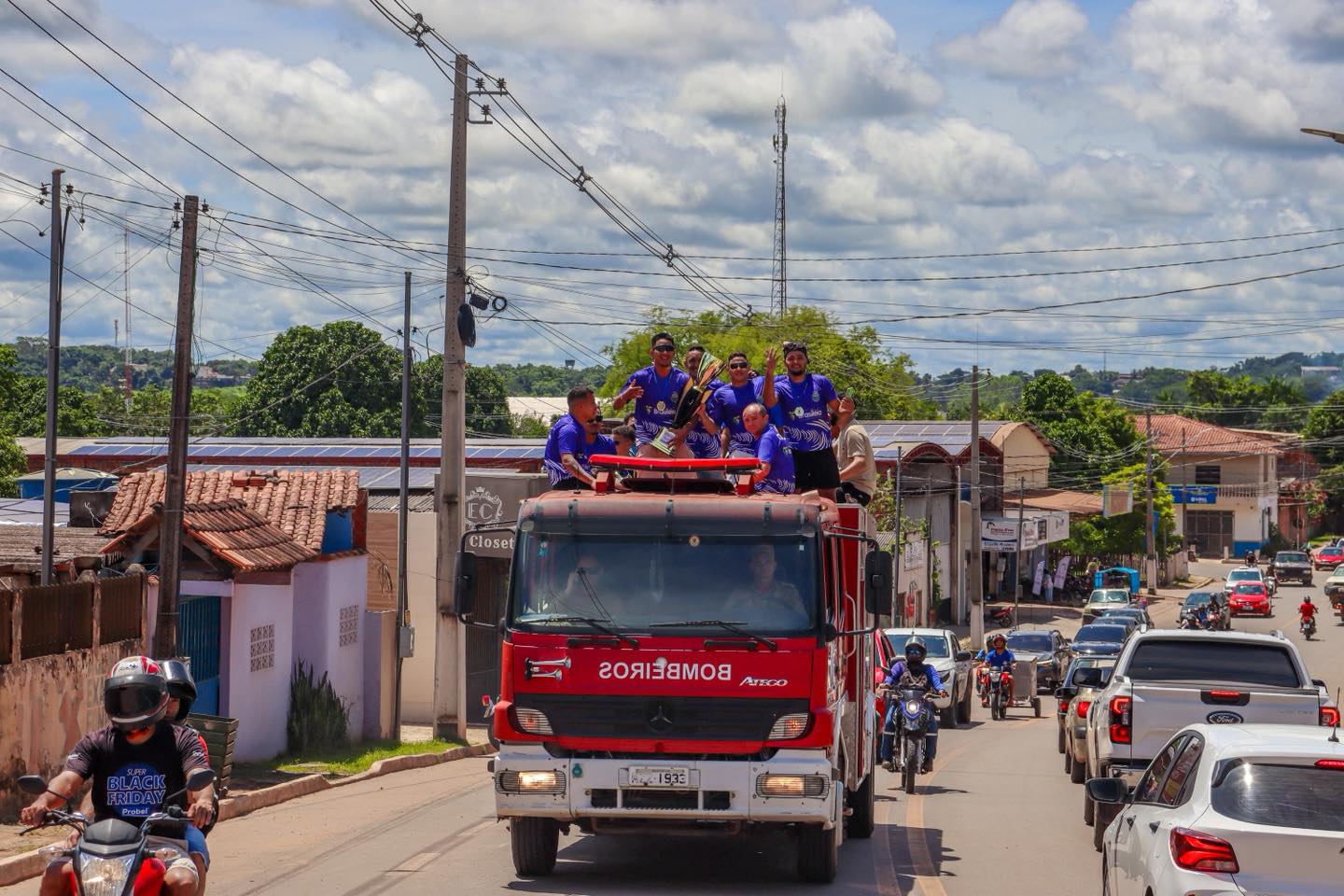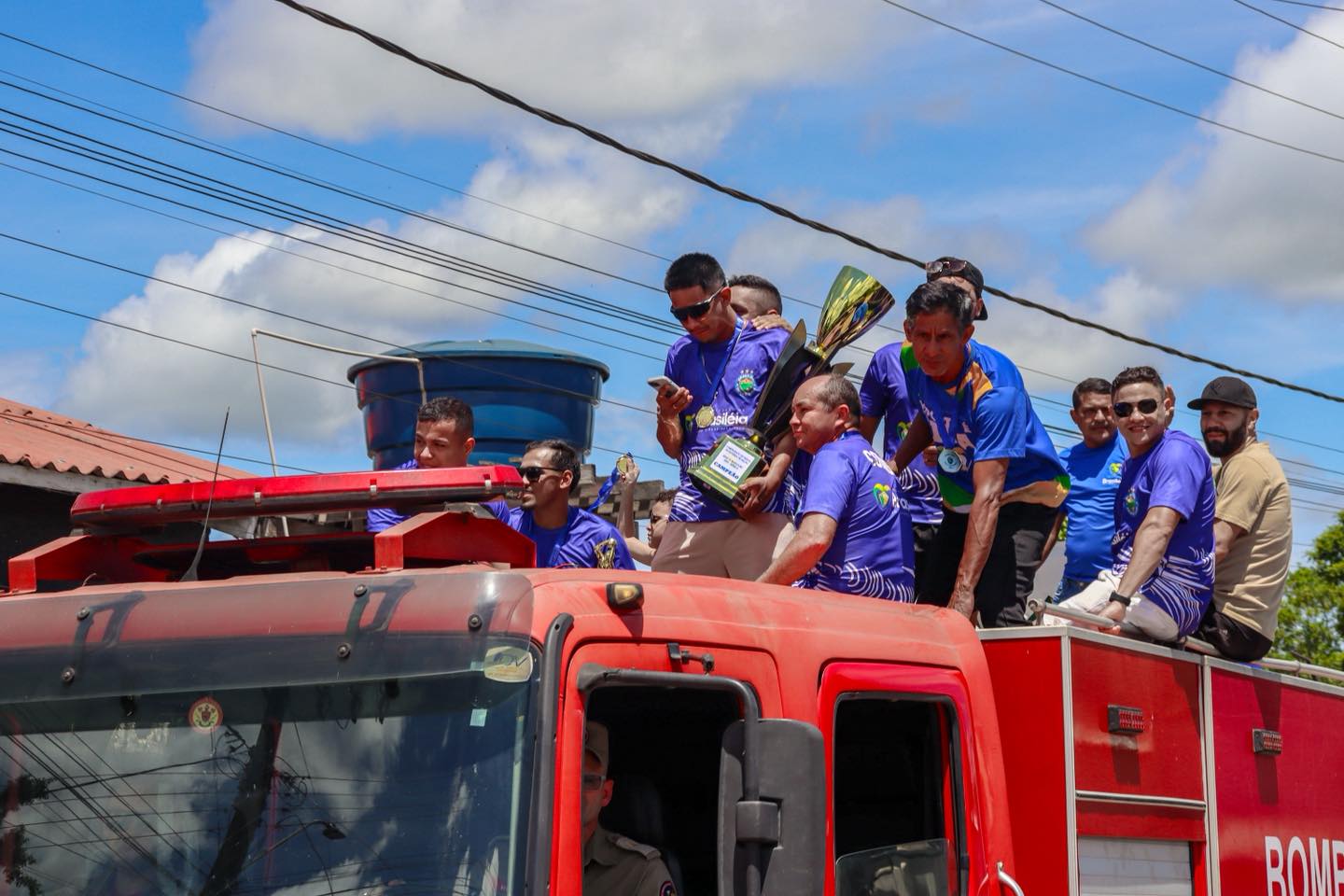 Carlinhos do Pelado se juntou aos atletas tetracampeões acreanos em festa que incluiu tapete azul, carro aberto e encerramento com “banho da alegria” do Corpo de Bombeiros. Foto: captada