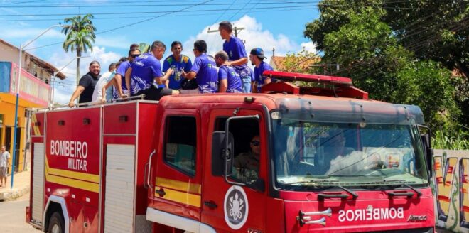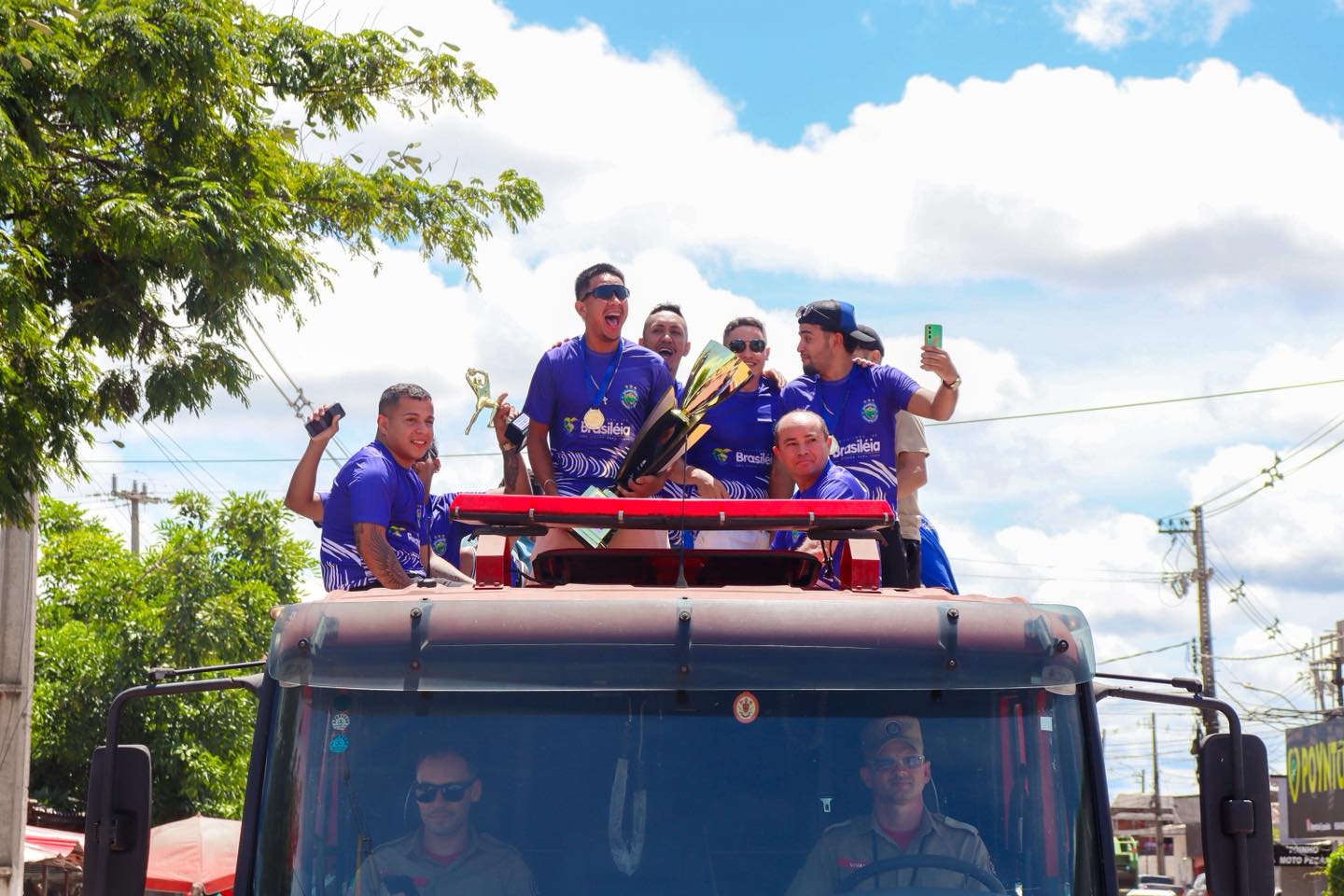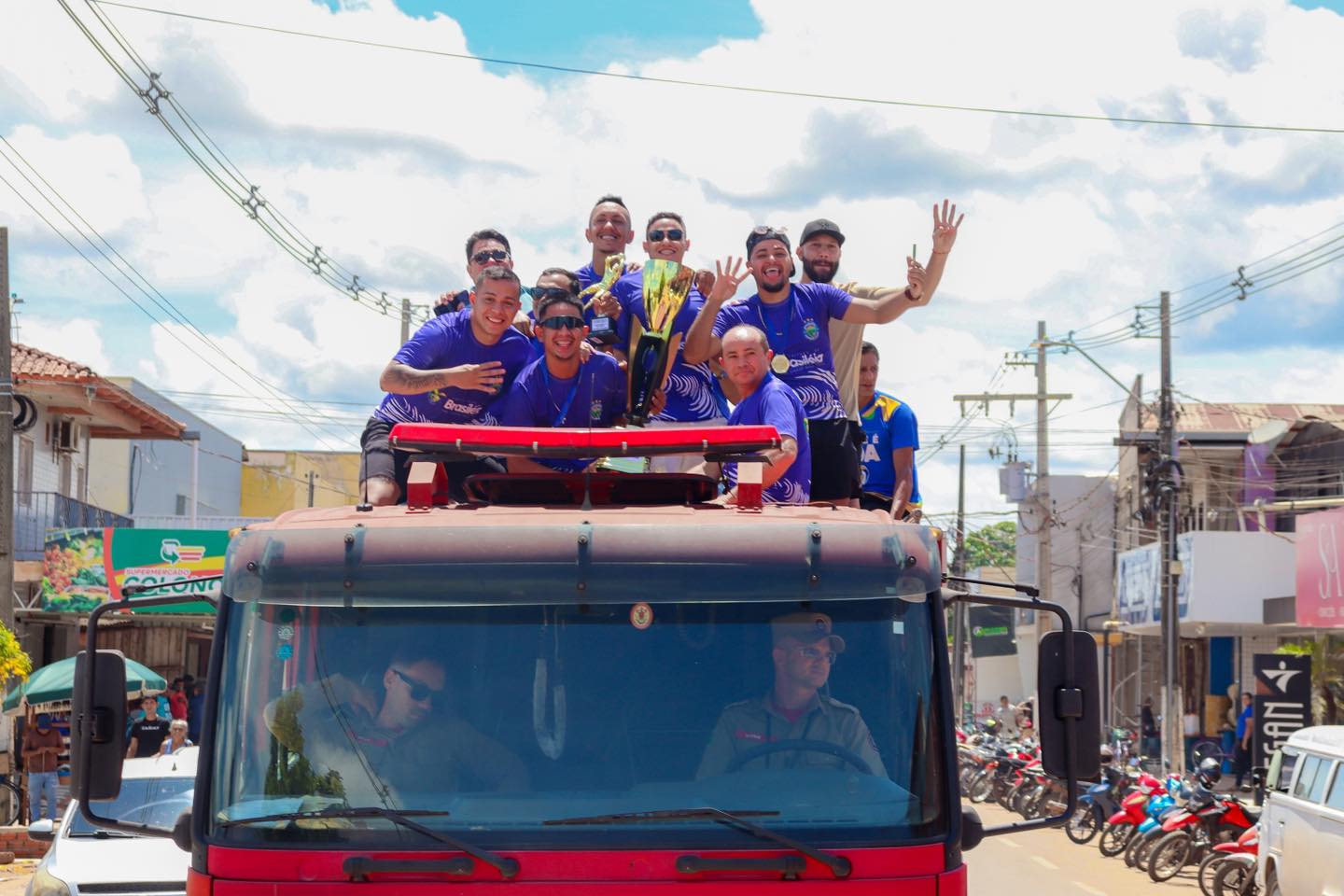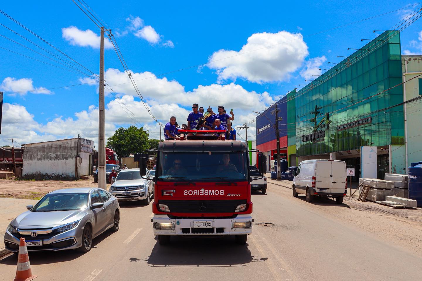 Carlinhos do Pelado se juntou aos atletas tetracampeões acreanos em festa que incluiu tapete azul, carro aberto e encerramento com “banho da alegria” do Corpo de Bombeiros. Foto: captada