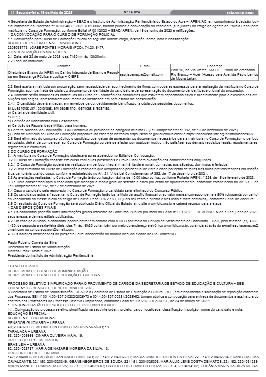 A Secretaria de Estado de Administração (Sead) e a Secretaria de Estado de Educação e Cultura (SEE) do Acre convocaram nesta segunda-feira, 19, por meio dos editais nº 066/2025 e nº 039/2025, os candidatos aprovados no processo seletivo simplificado destinado à contratação temporária de profissionais para atuação na Educação Especial. A convocação foi publicada no Diário Oficial do Estado desta segunda-feira (19).