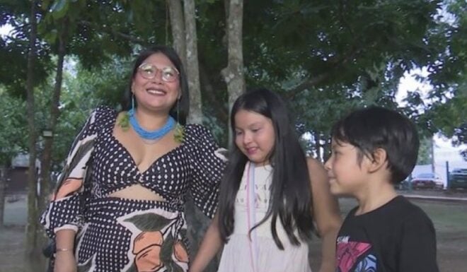 Alessandra Manchinery é doutora em geografia e mãe de Yomako, de nove anos, e Himiri, de cinco. Foto: Reprodução/Rede Amazônica Acre