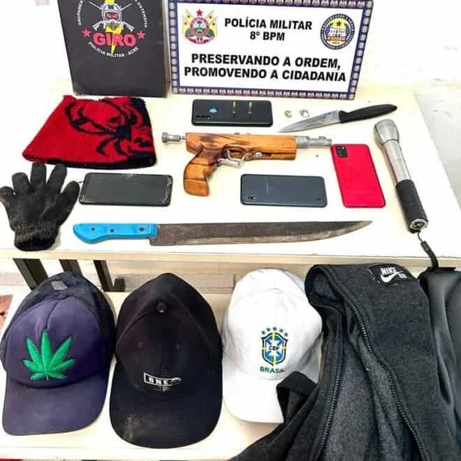 A segunda ocorrência se deu em Sena Madureira, na BR-364, quando guarnições do 8º Batalhão de Polícia Militar (8º BPM), durante operação avistou sete pessoas de bicicleta. Foram encontrados com eles uma arma de fogo de fabricação caseira, munições e armas brancas.