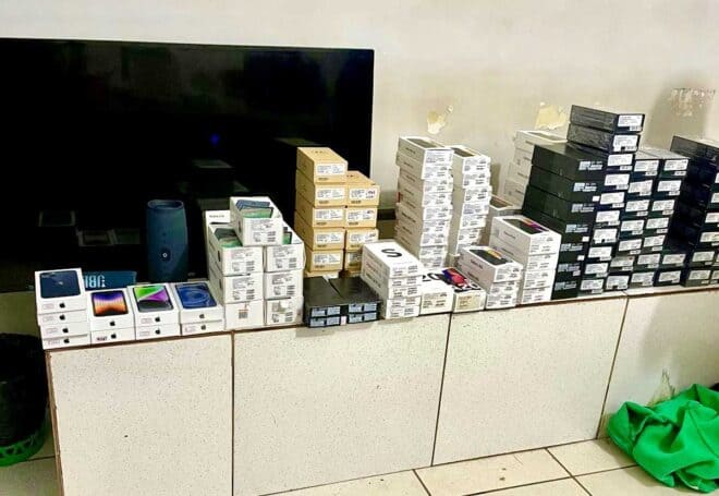 Os policiais foram acionados para atender a ocorrência e se deslocaram até a referida loja. Chegando ao local, encontraram o vigilante com as mãos amarradas e a loja violada, com um buraco na parede. Os envolvidos subtraíram smartphones e acessórios para aparelhos celulares e outros itens eletrônicos, além da quantia de 10.072,00 em dinheiro.