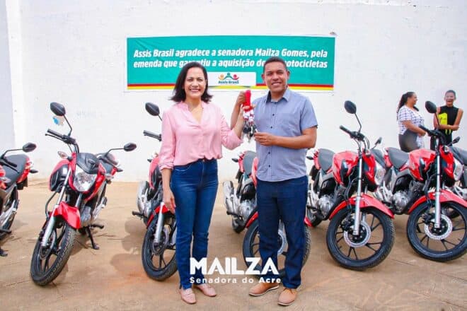 À prefeitura de Assis Brasil teve sua frota renovada com a chegada de 10 novas motocicletas adquiridas com uma emenda individual da senadora Mailza (Progressistas-AC).