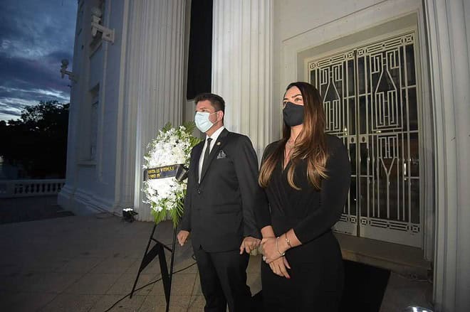 Vestindo terno preto e acompanhado pela primeira-dama Ana Paula Cameli, o governador Gladson Cameli depositou duas coroas de flores em respeito às vítimas da Covid-19 no Acre. O ato solene aconteceu em dois momentos, no início da noite deste domingo, 28.