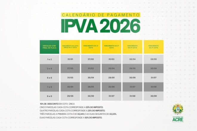Com a chegada do fim de ano e o período de planejamento financeiro, o governo do Acre, por meio da Secretaria da Fazenda (Sefaz), divulgou novas regras para o pagamento do Imposto sobre a Propriedade de Veículos Automotores (IPVA) para o ano de 2026. A nova regulamentação está na edição do Diário Oficial do Estado (DOE) desta segunda-feira, 22.