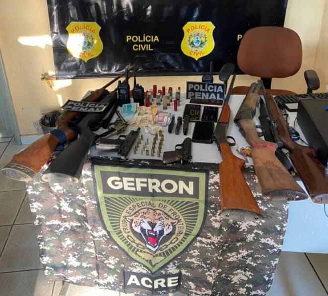 Ação integrada (Grupo Especial de Fronteira – Gefron, Polícia Civil e Polícia Penal), realizada no Ramal 59, zona rural de Brasileia, nesta segunda-feira, 18, resultou na prisão em flagrante de dois homens e na apreensão de duas pistolas (9mm), um revólver, calibre 22, uma espingarda, calibre 12, cano duplo, três rifles (22) e uma espingarda, calibre 32, além de porções de cocaína e munições.