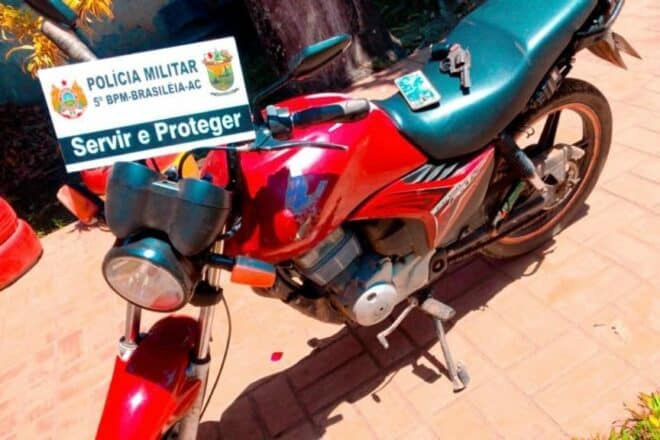 A motocicleta foi apreendida após denúncia de que dois homens estariam cometendo roubos na região, usando um veículo com as mesmas características. Ao ser localizada pelos polícias, os homens empreenderam fuga, no entanto abandoram a moto, um revólver e dois celulares.