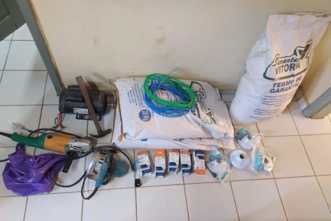 O furto qualificado ocorreu no dia 26 de julho, no período noturno, mediante arrombamento. Os criminosos levaram sacas de sementes de capim, motor de betoneira, makita, lixadeira, além de outros materiais de construção. Uma das vítimas é um idoso de 64 anos. A outra vítima é um empreiteiro de 49 anos.