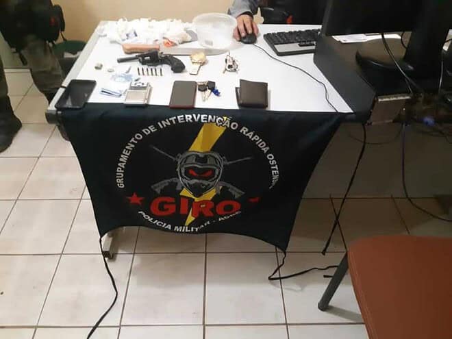 A equipe recebeu uma denúncia anônima de que dois homens estariam em via pública portando uma arma de fogo. Imediatamente, os militares foram ao endereço e conseguiram abordar a dupla, com a qual foram encontrados um revólver calibre 22, com seis cartuchos, uma porção de cocaína e maconha, além de uma balança de precisão.