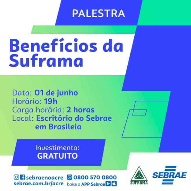 O Sebrae realiza, nesta quinta-feira, 1º de junho, a palestra “Benefícios da Suframa”, em Brasileia. O objetivo é mostrar o papel que a Superintendência da Zona Franca de Manaus (Suframa) tem no desenvolvimento econômico, e seus benefícios para o empresário que fizer seu cadastro junto à instituição.