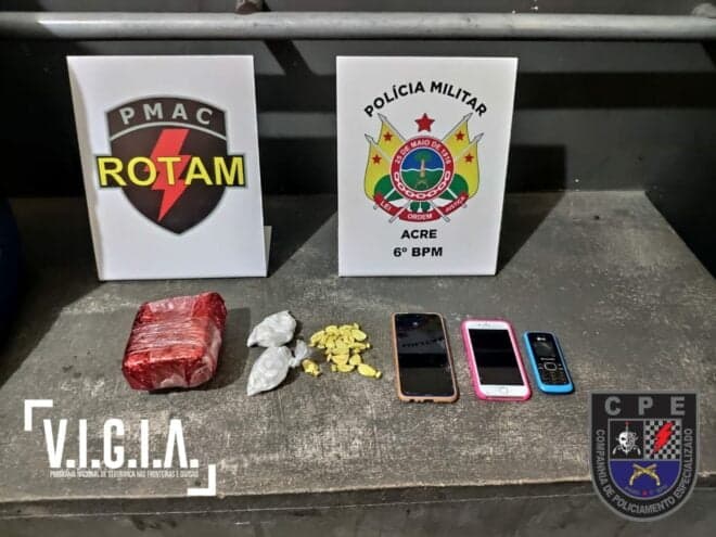 Militares da Companhia de Rondas Ostensivas Tático Móvel (ROTAM), do 6° Batalhão de Polícia Militar (6° BPM), abordaram duas pessoas, em uma motocicleta Honda Biz, de cor vermelha. Durante as buscas foram encontradas 500 gramas de maconha, 100 gramas de cloridrato de cocaína e dois aparelhos celulares. A dupla foi presa e encaminhada a Delegacia de Cruzeiro do Sul.