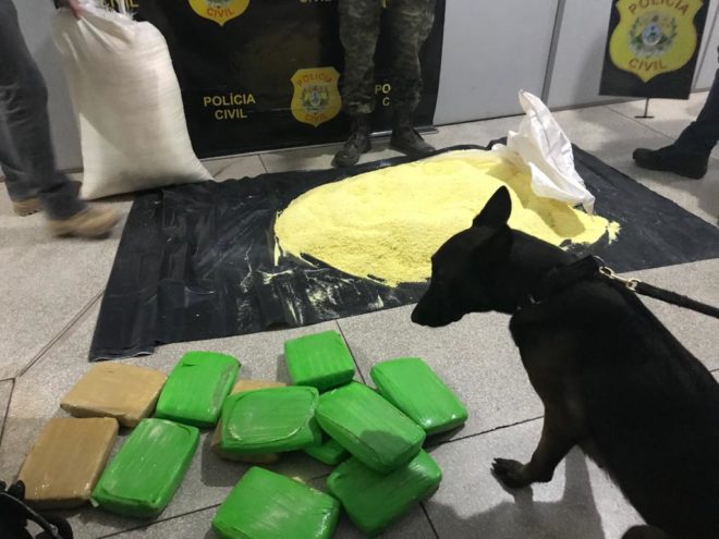 Por: Numa ação integrada ocorrida na noite dessa terça-feira, 8, cães farejadores da Companhia de Operações Especiais (COE), equipes do Grupamento Especial de Fronteira (GEFRON) e da Polícia Civil, apreenderam cerca de 20 quilos de skunk que estavam escondidos em sacos de farinha. A apreensão aconteceu durante abordagem a dois ônibus na BR-364, em Cruzeiro do Sul.