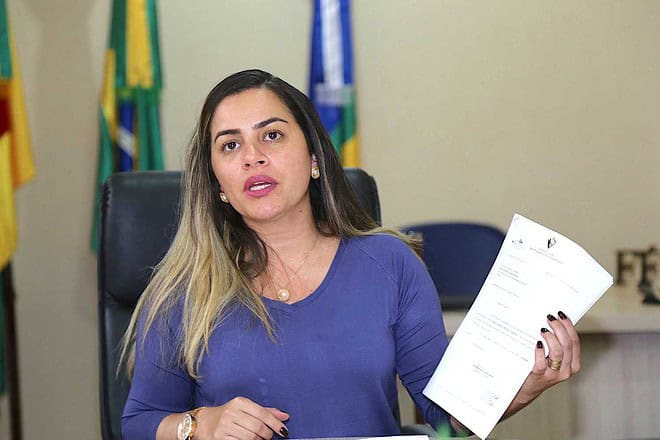 Fernanda mostra documentos onde mostra que recebeu a prefeitura com quase 80% de inchaço na folha – Foto: Alexandre Lima