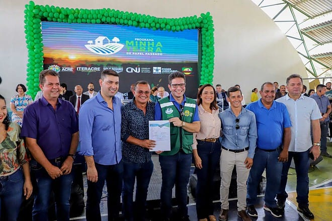 Em um marco de grande importância para promover a regularização fundiária no Acre, o governo do Estado, por meio do Instituto de Terras do Acre (Iteracre), em parceria com o Poder Judiciário, realizou nesta segunda-feira, 28, a cerimônia de entrega de mil títulos de regularização fundiária em Feijó, pelo Programa Minha Terra de Papel Passado, num investimento de mais de R$ 6 milhões. O evento foi realizado na Escola de Ensino Médio José Gurgel Rabelo, reunindo o governador Gladson Cameli, autoridades e os beneficiários.