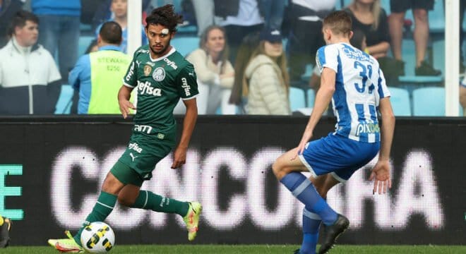 Gustavo Scarpa domina a bola pelo Palmeiras no empate com o Avaí pelo Brasileirão 2022 CESAR GRECO/SITE OFICIAL DO PALMEIRAS (26.6.2022)