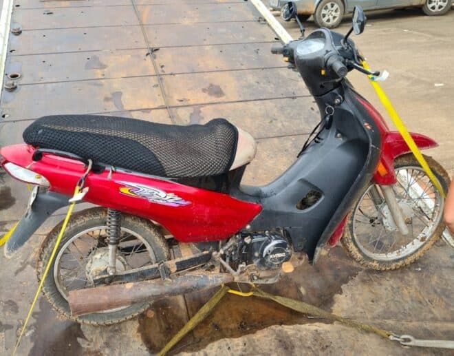 Acionados via COPOM para realizarem uma averiguação, os militares localizaram uma motocicleta, Biz vermelha, abandonada. O veículo estaria com a chave na ignição, corrente e placa quebradas.