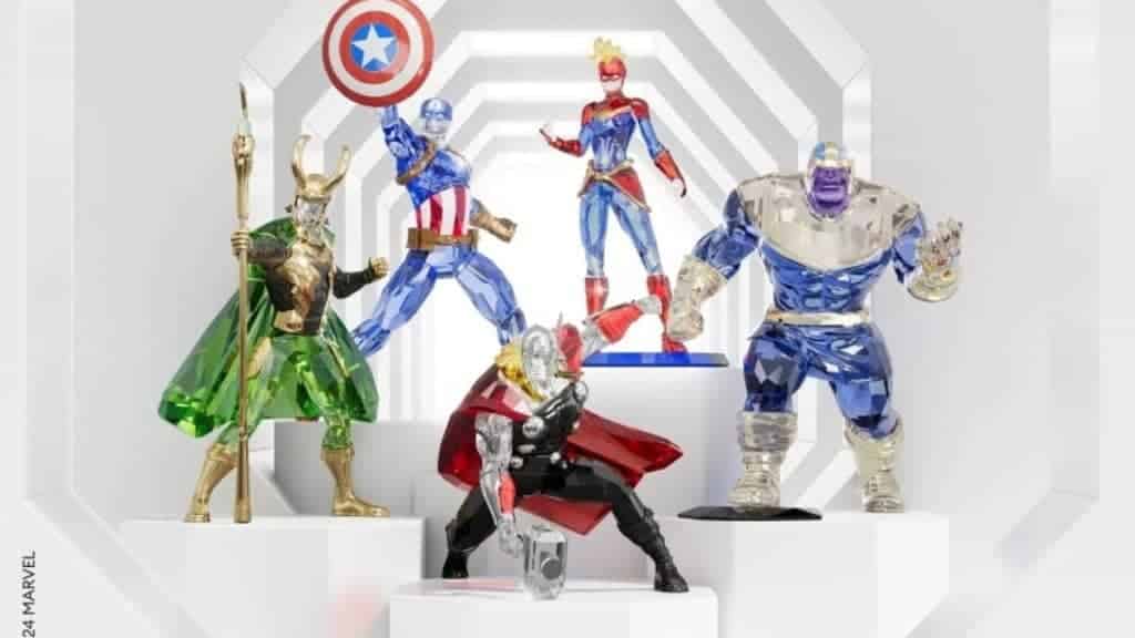 Os cristais Swarovski desta coleção apresentam facetas únicas e rentes, em tons brilhantes e ousados. A linha inclui figuras de personagens populares como Capitão América, Thor e Capitão Marvel, além de dois vilões emblemáticos: Thanos e Loki e Capitã Marvel.