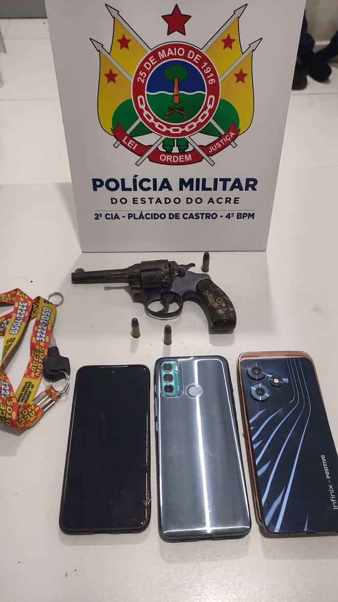 Policiais militares que atuam em Plácido de Castro capturaram um foragido da justiça, apreenderam uma arma de fogo e recuperaram um veículo, motocicleta Honda/Twister, na sexta-feira, 11, na zona rural do município.