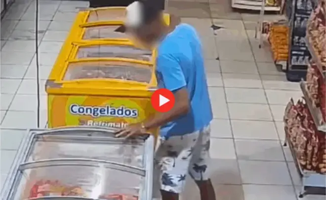 Câmeras de segurança registraram, no último domingo (27), um furto em um supermercado localizado no Centro de Sena Madureira. As imagens mostram o momento em que um homem, ainda não identificado, vai até o setor de frios do comércio, pega uma bandeja de peito de frango e esconde o item nas partes íntimas antes de deixar o local.