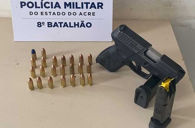 Uma guarnição do 8º Batalhão da Polícia Militar do Acre (PMAC) apreendeu uma arma de fogo e 23 munições, em ocorrência na tarde deste sábado, 27, em Sena Madureira. O homem que portava o armamanto foi preso, suspeito de integrar uma facção criminosa e orquestrar possíveis ataques a um grupo criminoso rival.
