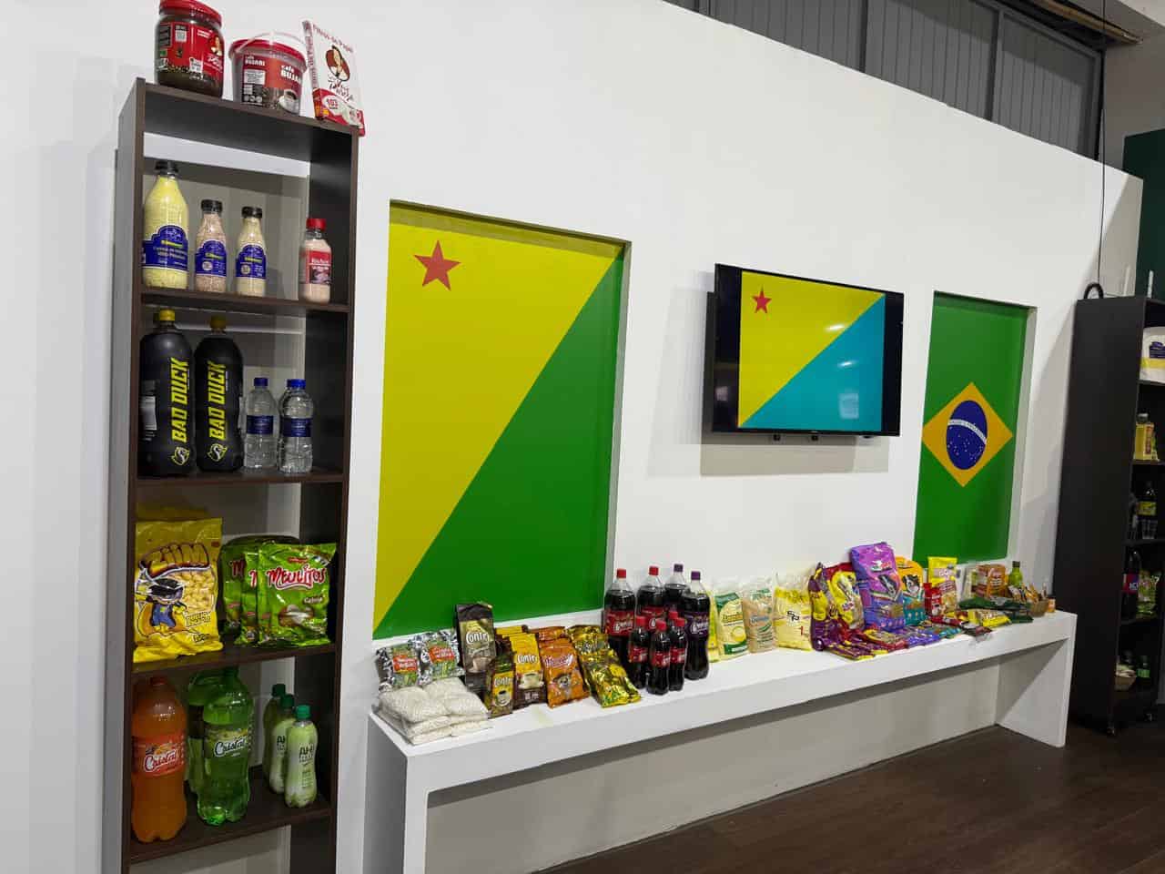 O estande do Acre apresenta produtos que traduzem a diversidade econômica e cultural do estado, como: peças de marchetaria, café, farinha de Cruzeiro do Sul, biscoitos, botas, castanhas, rações para pequenos animais e criações artesanais.