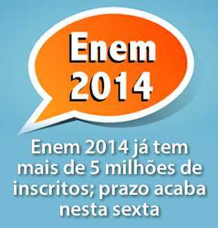 Mais de 5 milhões de pessoas já fizeram a inscrição para a edição de 2014 do Exame Nacional do Ensino Médio (Enem), segundo balanço parcial divulgado pelo Instituto Nacional de Estudos e Pesquisas Educacionais (Inep). Às 13h desta terça-feira (20), o número de inscrições era de 5.008.713 candidatos. Os interessados em participar do exame têm até as 23h59 de sexta-feira (23) para se inscrever pelo site oficial do exame. O Enem será realizado nos dias 8 e 9 de novembro.