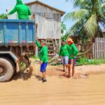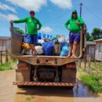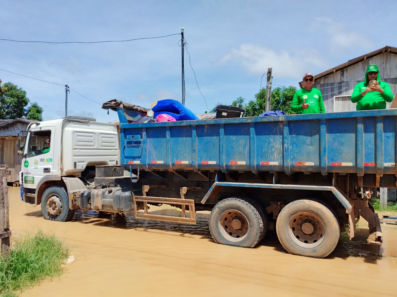 As equipes do Deracre estão auxiliando na retirada de móveis, eletrodomésticos e pertences das casas atingidas, garantindo que os itens sejam levados para locais seguros, como residências de familiares e áreas fora da zona de inundação, reduzindo os prejuízos das famílias afetadas.